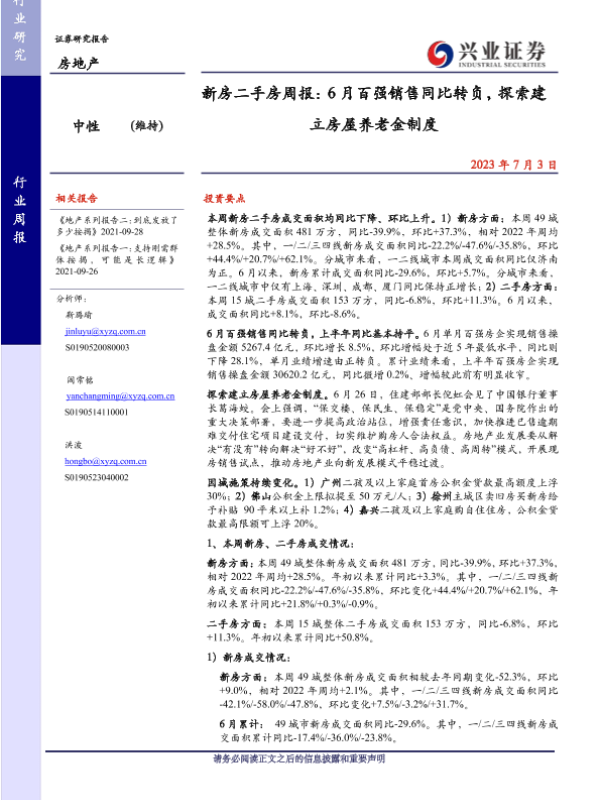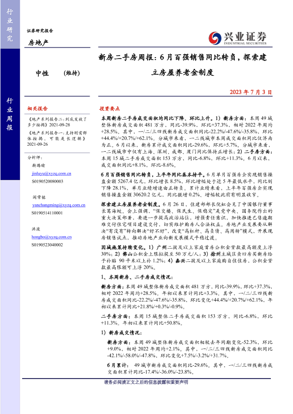 【兴业证券】【20230703】新房二手房周报:6月百强销售同比转负,探索建立房屋养老金制度-26页
