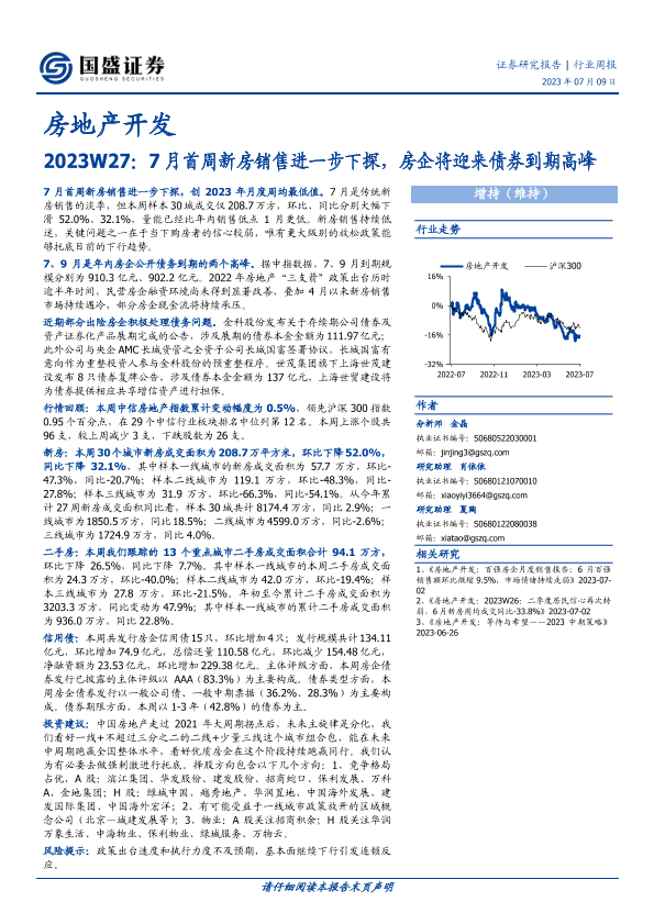 【国盛证券】【20230709】房地产开发2023W27:7月首周新房销售进一步下探,房企将迎来债券到期高峰-13页