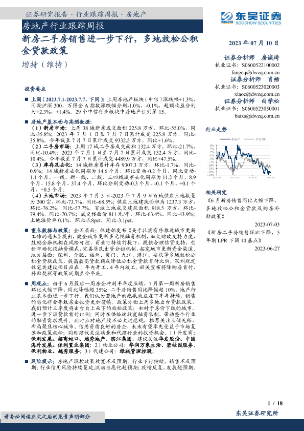 【东吴证券】【20230710】房地产行业跟踪周报:新房二手房销售进一步下行,多地放松公积金贷款政策-18页
