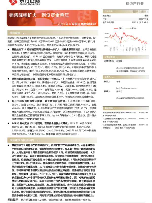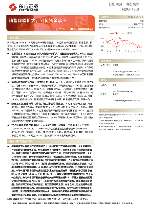 【东方证券】【20230717】房地产行业2023年6月统计局数据点评:销售降幅扩大,到位资金承压-10页