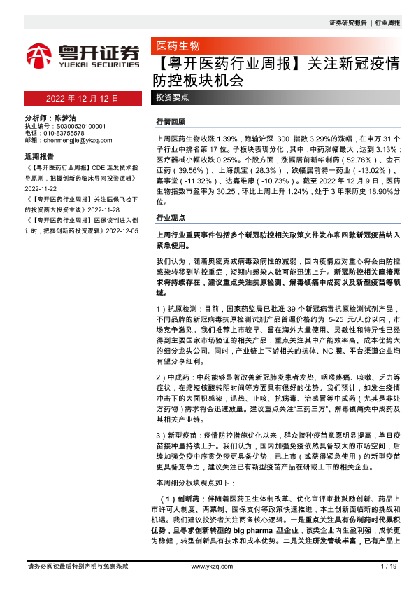 【粤开证券】【20221212】【粤开医药行业周报】关注新冠疫情防控板块机会-19页
