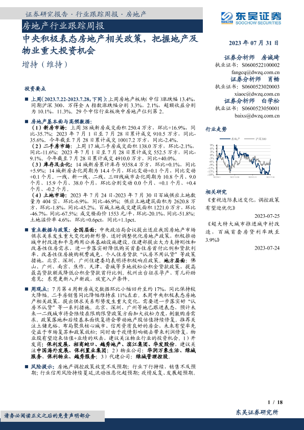 【东吴证券】【20230731】房地产行业跟踪周报:中央积极表态房地产相关政策,把握地产及物业重大投资机会-18页