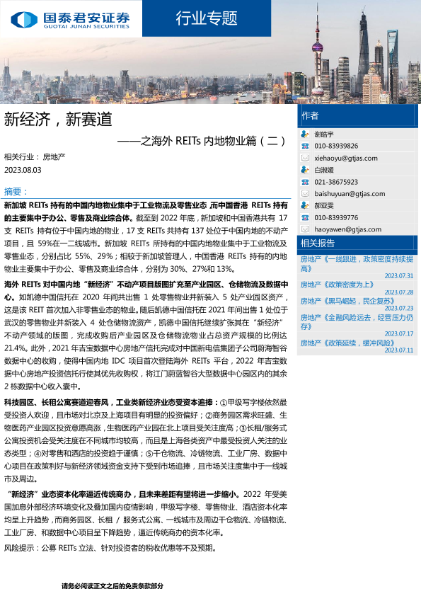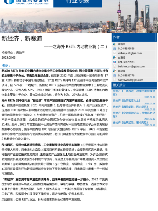 【国泰君安证券】【20230803】新经济,新赛道——之海外REITs内地物业篇-20页