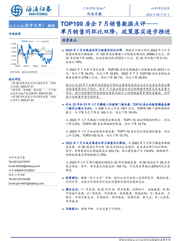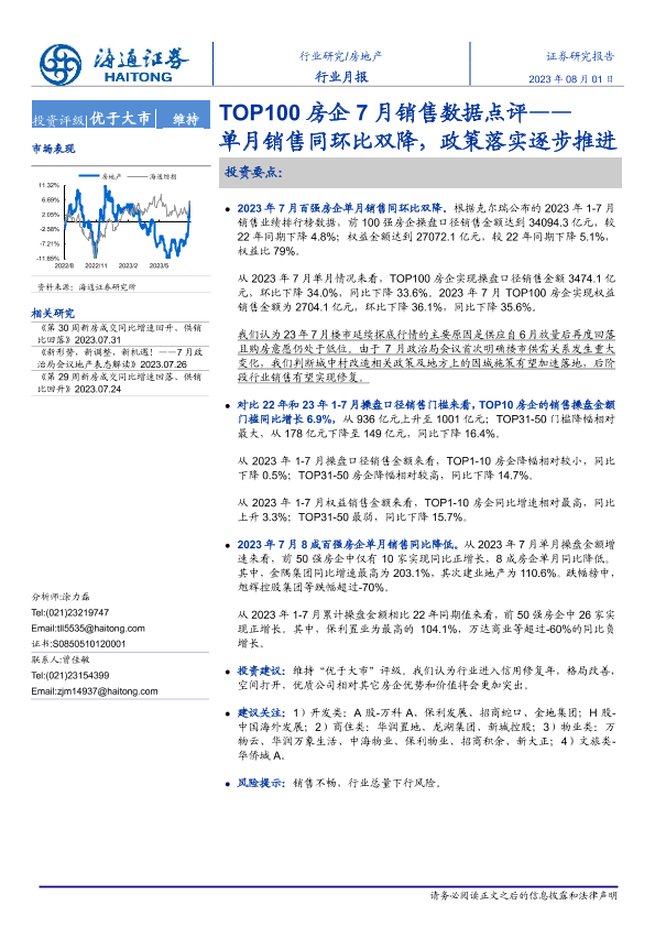 【海通证券】【20230801】TOP100房企7月销售数据点评:单月销售同环比双降,政策落实逐步推进-10页