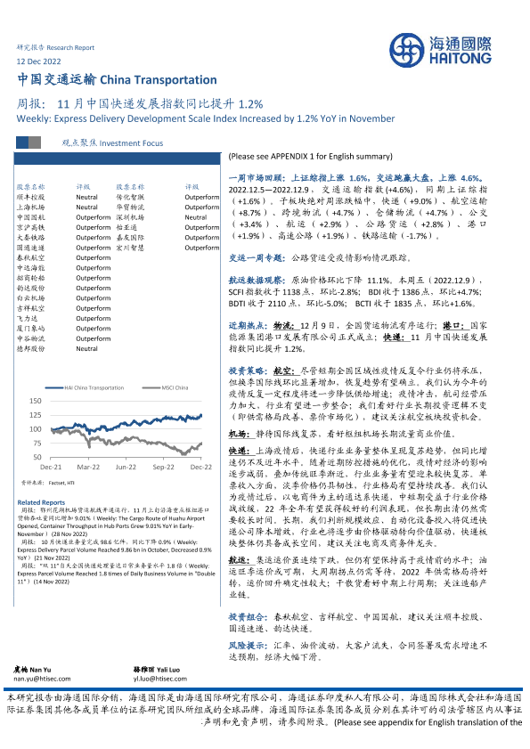 【海通国际】【20221212】中国交通运输行业周报:11月中国快递发展指数同比提升1.2%-15页