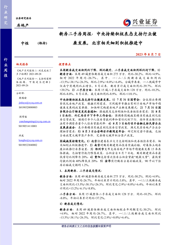 【兴业证券】【20230807】新房二手房周报:中央持续积极表态支持行业健康发展-26页