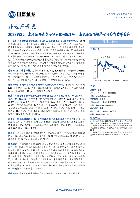 【国盛证券】【20230813】房地产开发2023W32:本周新房成交面积同比-35.1%,基本面疲弱静待核心城市政策落地-15页