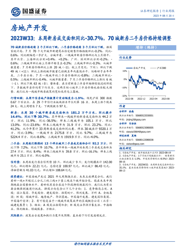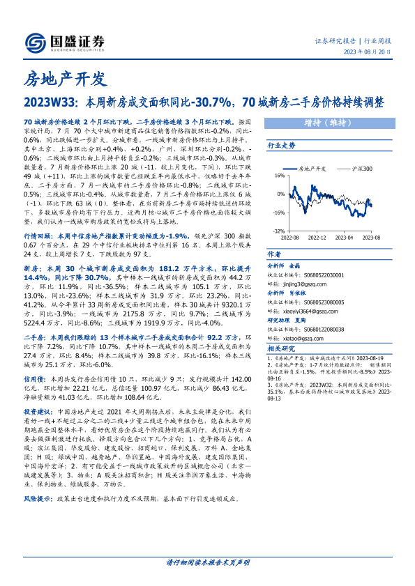 【国盛证券】【20230820】2023W33:本周新房成交面积同比-30.7%,70城新房二手房价格持续调整-15页