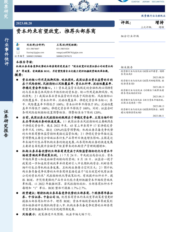 【国泰君安证券】【20230820】资本约束有望放宽,推荐头部券商-20页