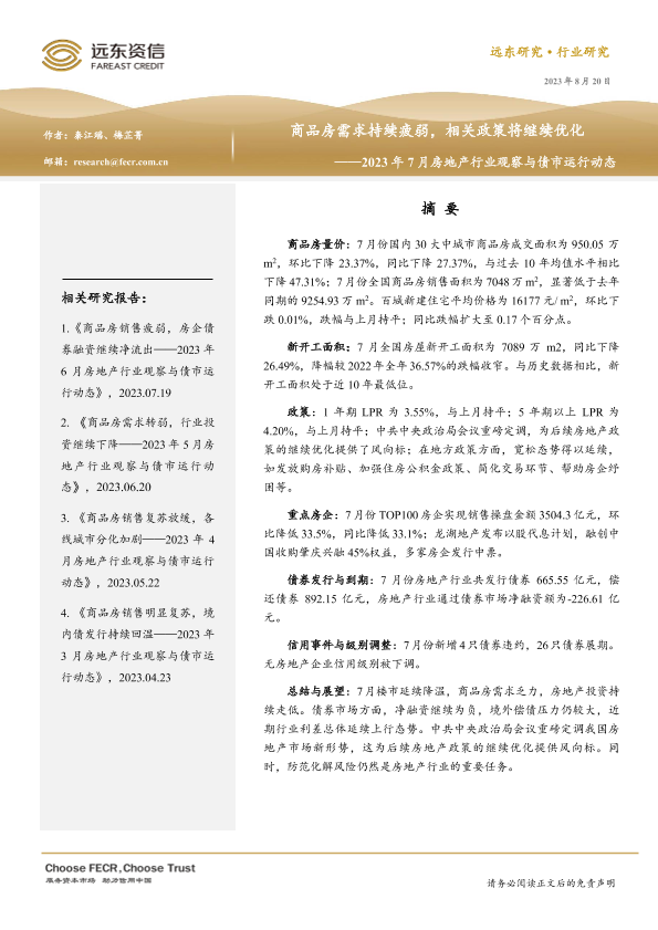 【远东资信】【20230821】2023年7月房地产行业观察与债市运行动态:商品房需求持续疲弱,相关政策将继续优化-20页