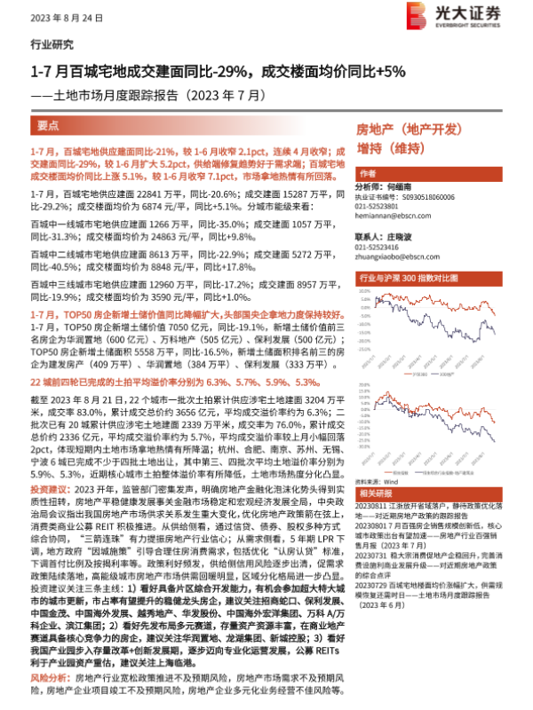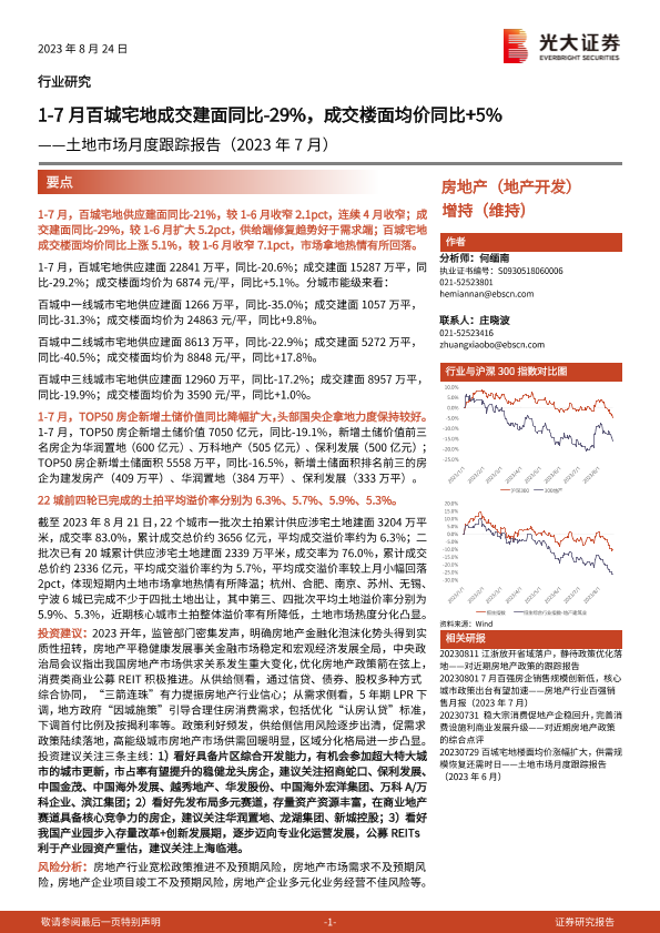 【光大证券】【20230824】1-7月百城宅地成交建面同比-29%,成交楼面均价同比+5%-16页