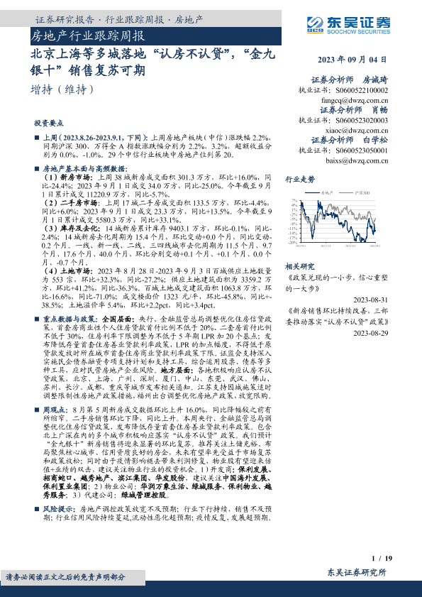 【东吴证券】【20230904】房地产行业跟踪周报:北京上海等多城落地“认房不认贷”,“金九银十”销售复苏可期-19页