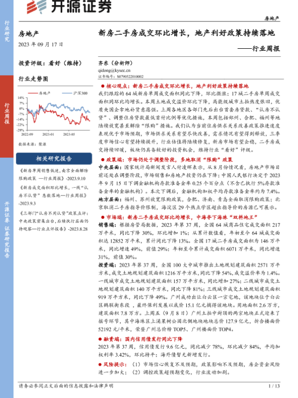 【开源证券】【20230917】房地产行业周报:新房二手房成交环比增长,地产利好政策持续落地-13页