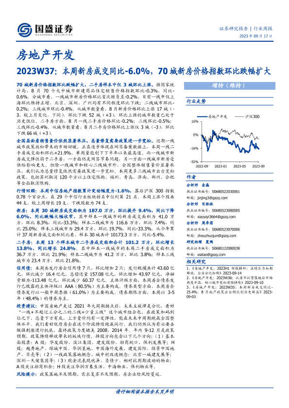【国盛证券】【20230917】2023W37:本周新房成交同比-6.0%,70城新房价格指数环比跌幅扩大-15页