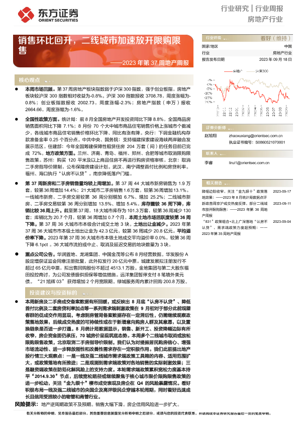 【东方证券】【20230918】2023年第37周地产周报:销售环比回升,二线城市加速放开限购限售-15页