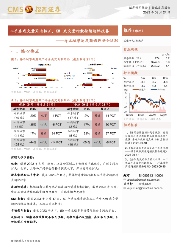 【海通证券】【20230924】样本城市周度高频数据全追踪-二手房成交量同比转正,KMI成交量指数持续边际改善-12页