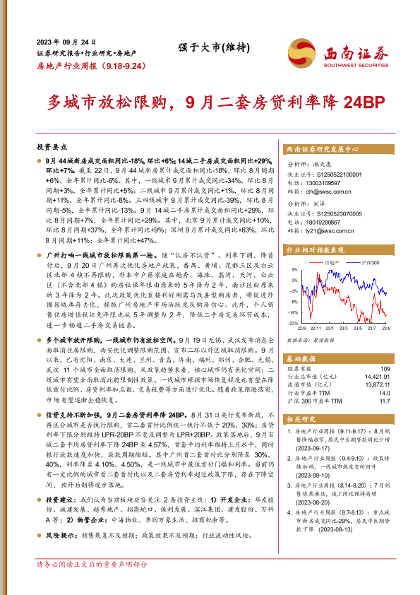 【西南证券】【20230924】房地产行业周报:多城市放松限购,9月二套房贷利率降24BP-15页