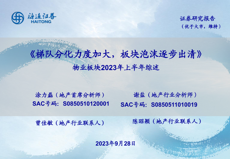 【海通证券】【20230928】物业板块2023年上半年综述:梯队分化力度加大,板块泡沫逐步出清-29页