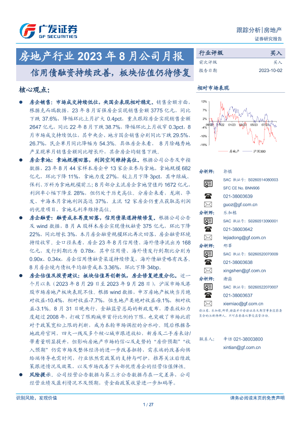 【广发证券】【20231002】房地产行业2023年8月公司月报:信用债融资持续改善,板块估值仍待修复-27页