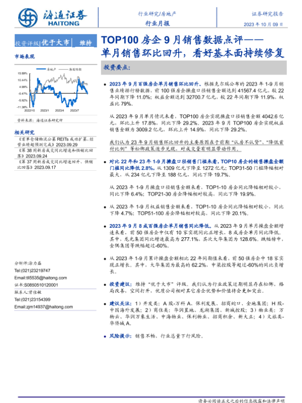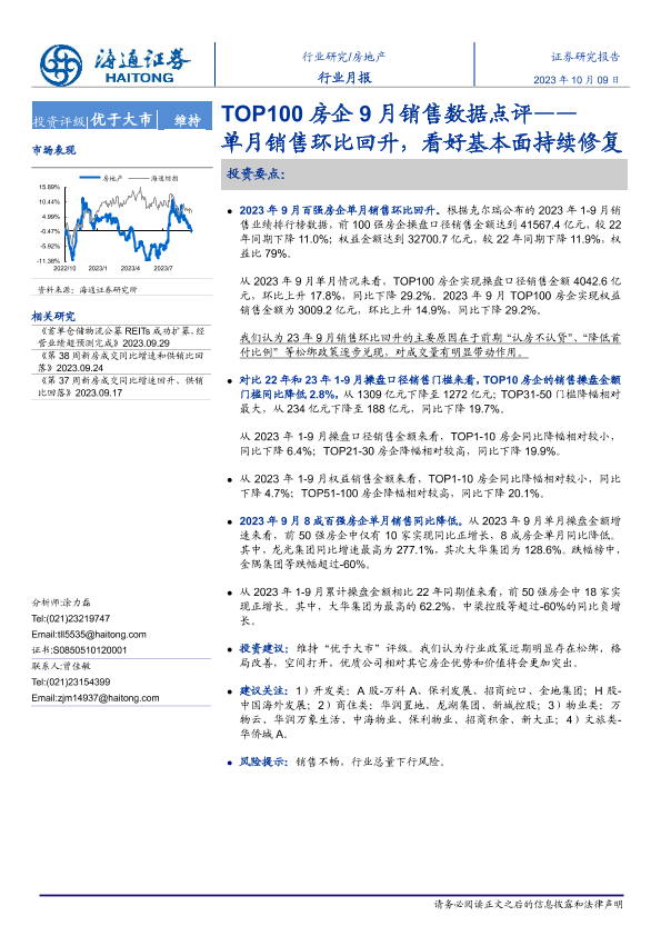 【海通证券】【20231009】TOP100房企9月销售数据点评:单月销售环比回升,看好基本面持续修复-10页