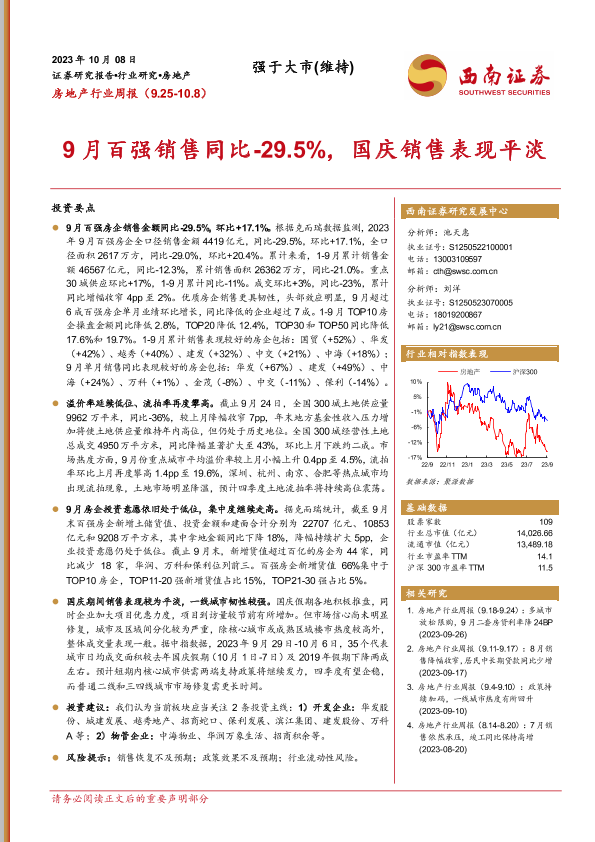 【西南证券】【20231008】房地产行业周报:9月百强销售同比-29.5%,国庆销售表现平淡-16页