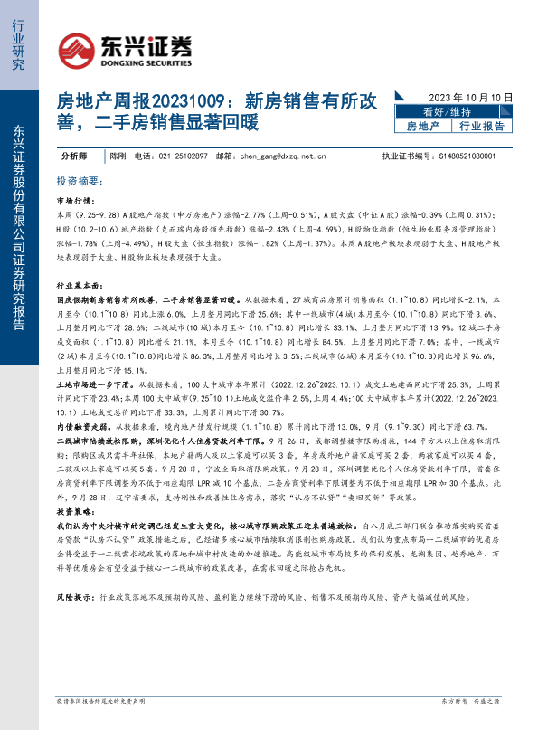 【东兴证券】【20231010】房地产周报:新房销售有所改善,二手房销售显著回暖-18页