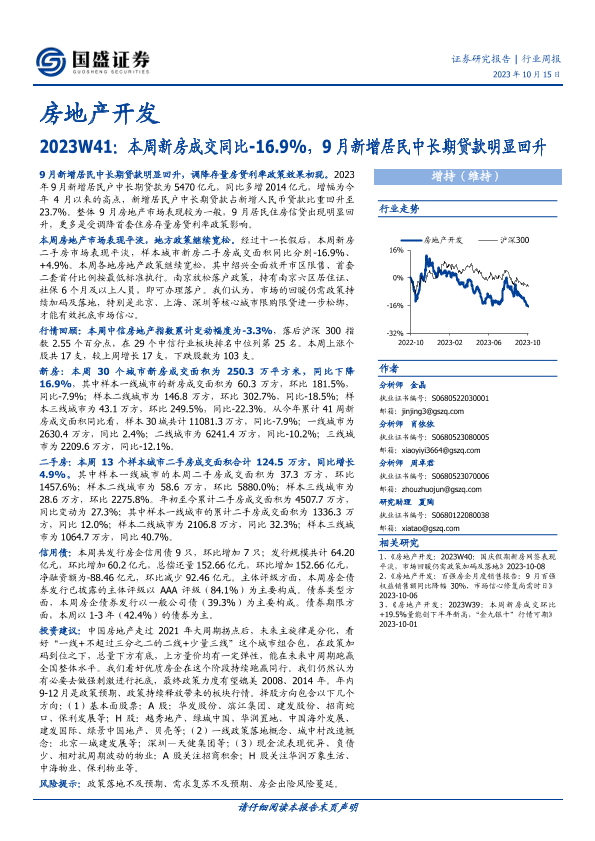 【国盛证券】【20231015】房地产开发2023W41:本周新房成交同比-16.9%,9月新增居民中长期贷款明显回升-14页