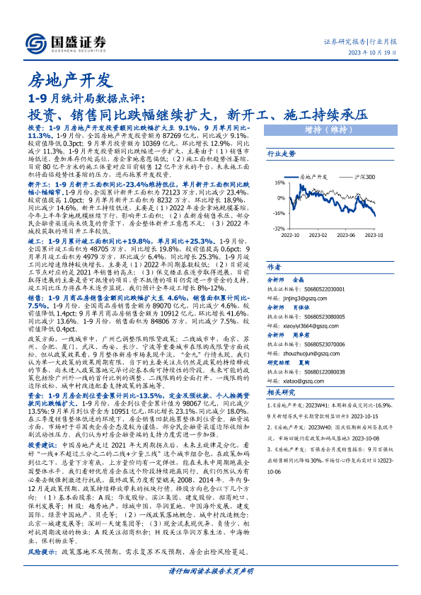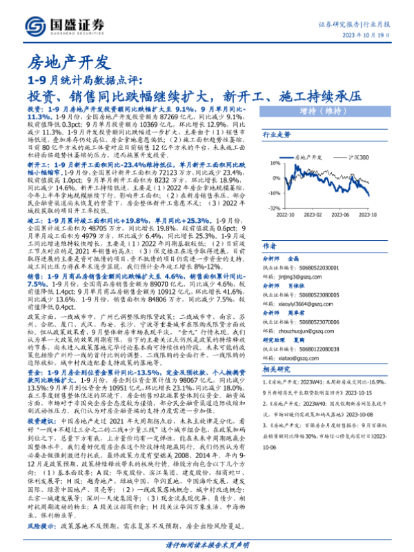 【国盛证券】【20231019】1-9月统计局数据点评:投资、销售同比跌幅继续扩大,新开工、施工持续承压-12页