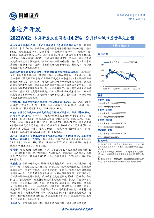 【国盛证券】【20231022】房地产开发2023W42:本周新房成交同比-14.2%,9月核心城市房价率先企稳-14页