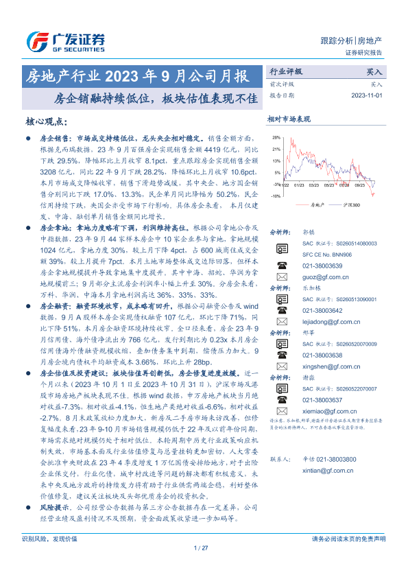 【广发证券】【20231101】房地产行业2023年9月公司月报:房企销融持续低位,板块估值表现不佳-27页