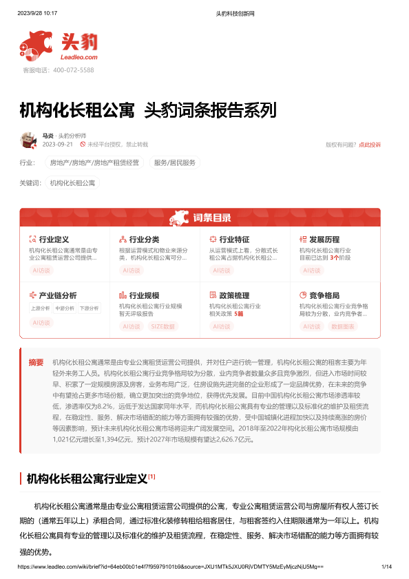 【头豹研究院】【20230921】机构化长租公寓 头豹词条报告系列-14页