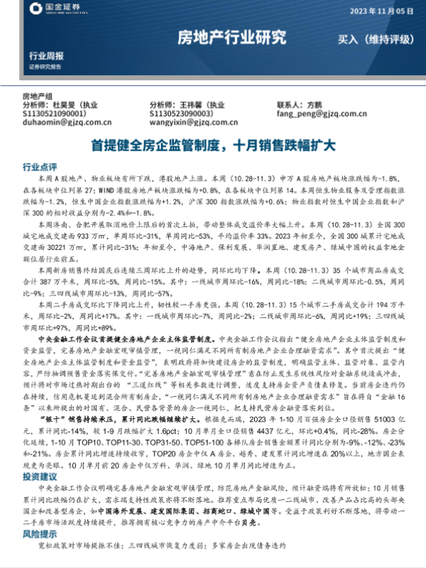 【国金证券】【20231105】房地产行业研究:首提健全房企监管制度,十月销售跌幅扩大-18页