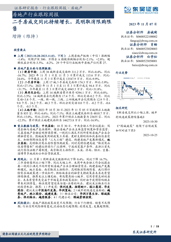 【东吴证券】【20231107】房地产行业跟踪周报:二手房成交同比持续增长,昆明取消限购限售-18页