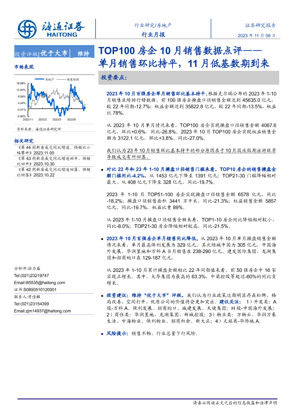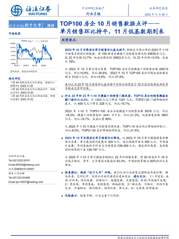 【海通证券】【20231106】TOP100房企10月销售数据点评:单月销售环比持平,11月低基数期到来-10页
