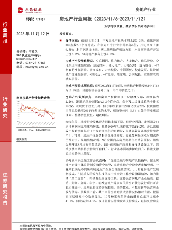 【东莞证券】【20231112】房地产行业周报:业绩持续修复,融资情况预计逐步回升-11页