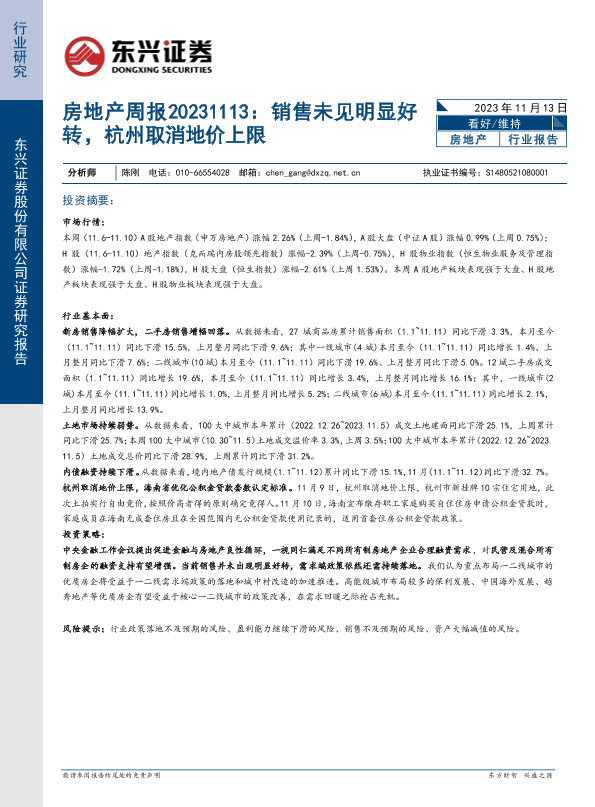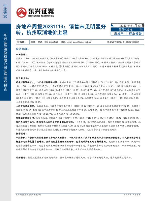 【东兴证券】【20231113】房地产周报:销售未见明显好转,杭州取消地价上限-18页