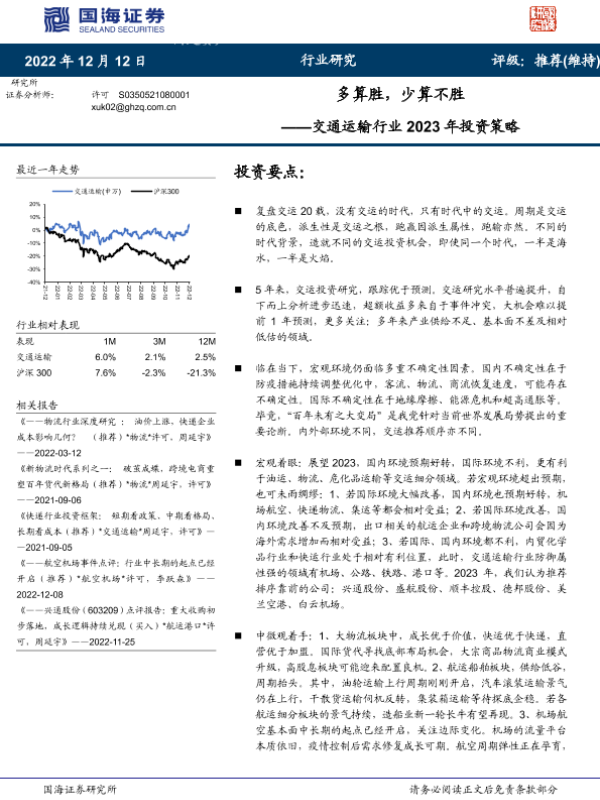【国海证券】【20221212】交通运输行业2023年投资策略:多算胜,少算不胜-58页