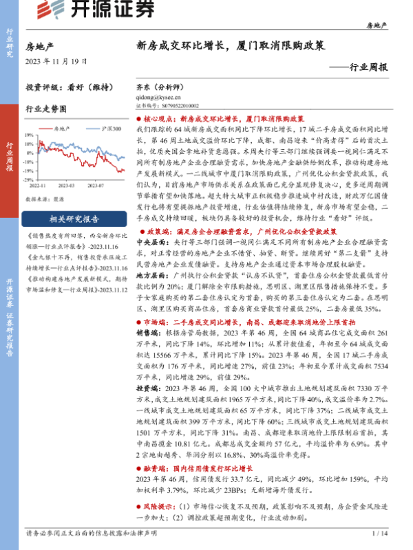 【开源证券】【20231119】房地产行业周报:新房成交环比增长,厦门取消限购政策-14页