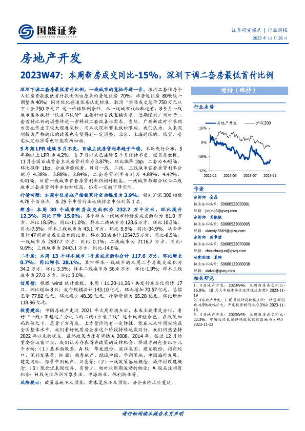 【国盛证券】【20231126】房地产开发2023W47:本周新房成交同比-15%,深圳下调二套房最低首付比例-14页