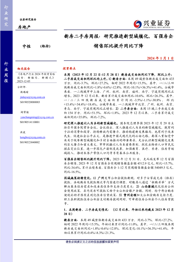 【兴业证券】【20240101】新房二手房周报:研究推进新型城镇化,百强房企销售环比提升同比下降-26页