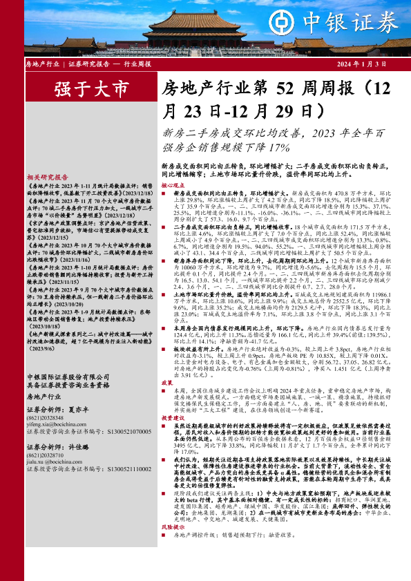 【中银证券】【20240103】房地产行业第52周周报:新房二手房成交环比均改善,2023年全年百强房企销售规模下降17%-25页