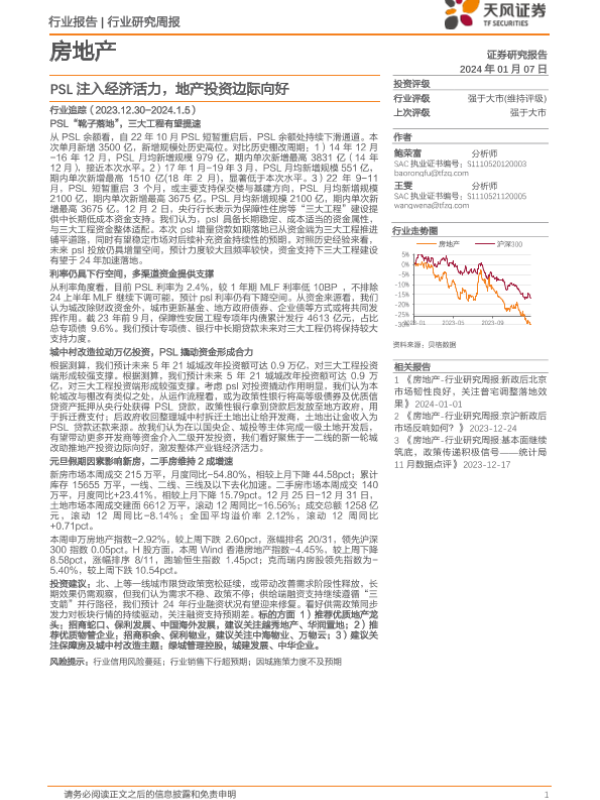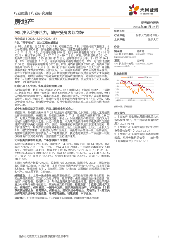 【天风证券】【20240107】房地产行业研究周报:PSL注入经济活力,地产投资边际向好-16页