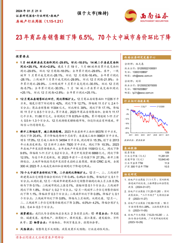 【西南证券】【20240121】房地产行业周报:23年商品房销售额下降6.5%,70个大中城市房价环比下降-15页