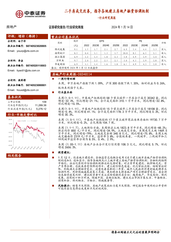 【中泰证券】【20240114】房地产行业研究周报:二手房成交改善,指导各地建立房地产融资协调机制-16页