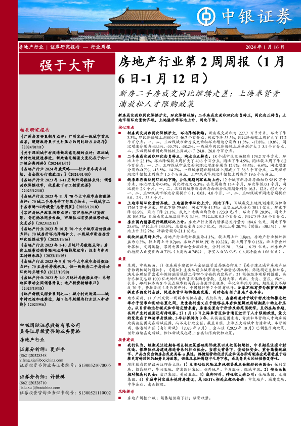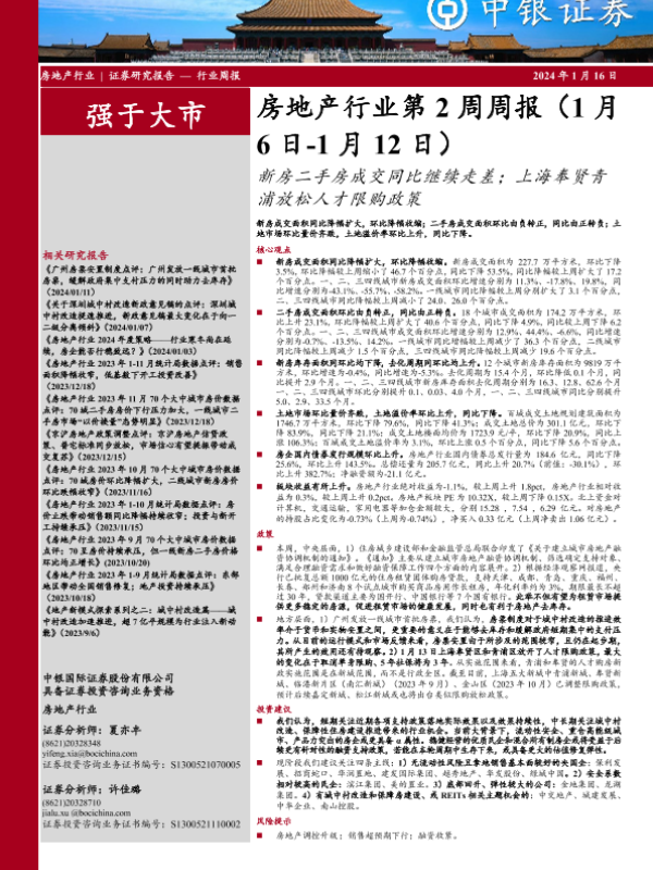 【中银证券】【20240116】房地产行业第2周周报:新房二手房成交同比继续走差;上海奉贤青浦放松人才限购政策-25页