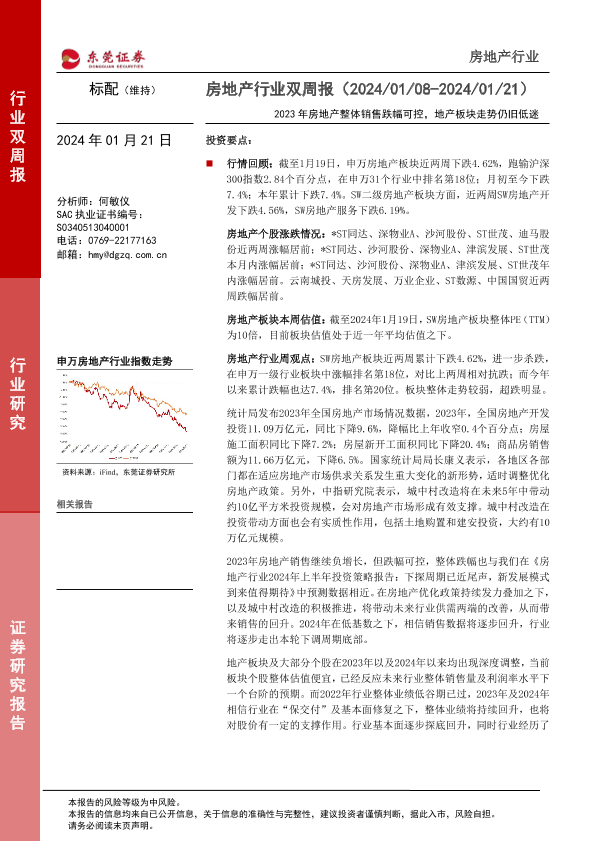 【东莞证券】【20240121】房地产行业双周报:2023年房地产整体销售跌幅可控,地产板块走势仍旧低迷-13页