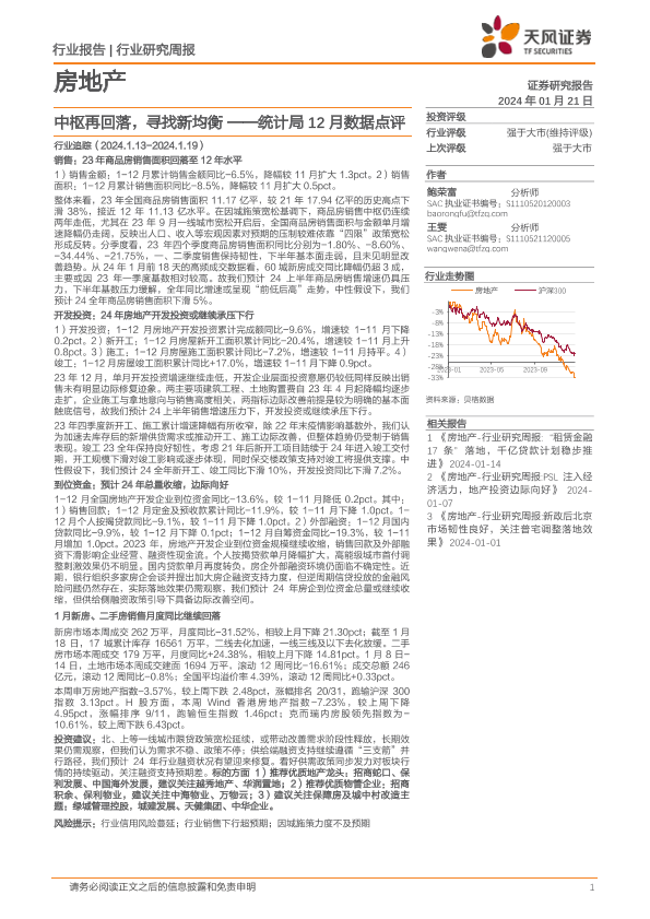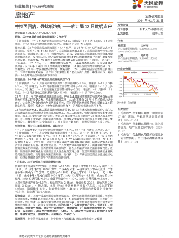 【天风证券】【20240121】房地产行业研究周报:统计局12月数据点评-中枢再回落,寻找新均衡-20页