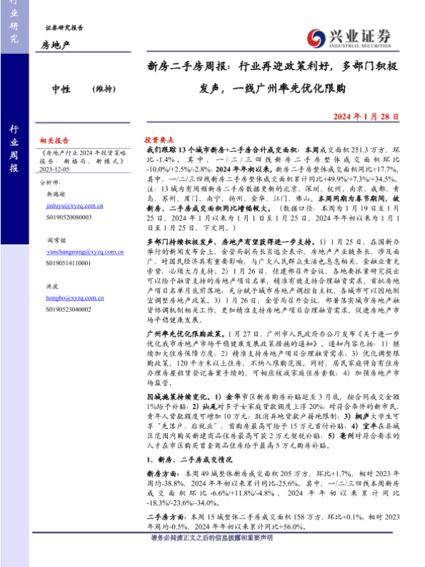 【兴业证券】【20240128】新房二手房周报:行业再迎政策利好,多部门积极发声,一线广州率先优化限购-26页