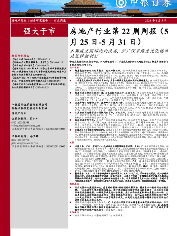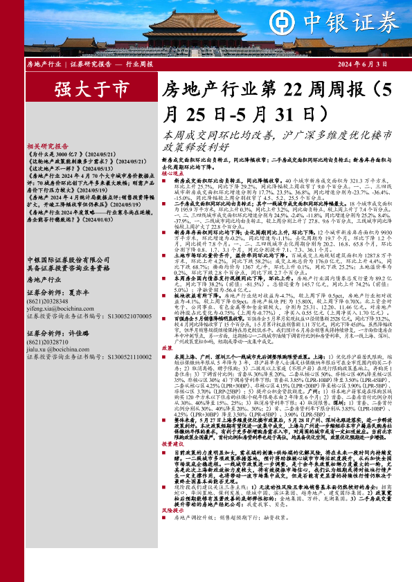 【中银证券】【20240603】房地产行业第22周周报:本周成交同环比均改善,沪广深多维度优化楼市政策释放利好-27页