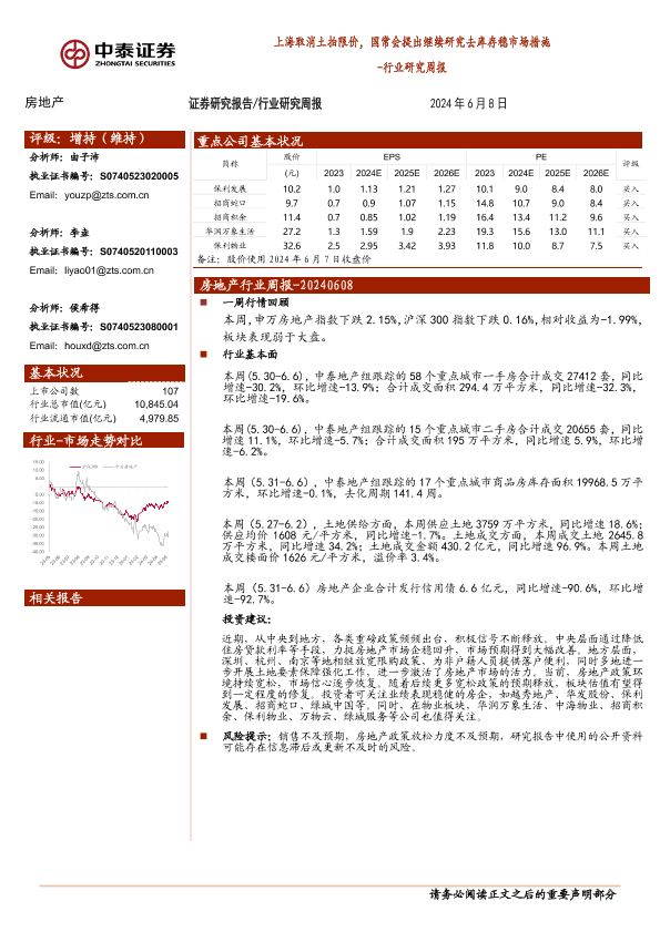 【中泰证券】【20240608】上海取消土拍限价,国常会提出继续研究去库存稳市场措施-15页